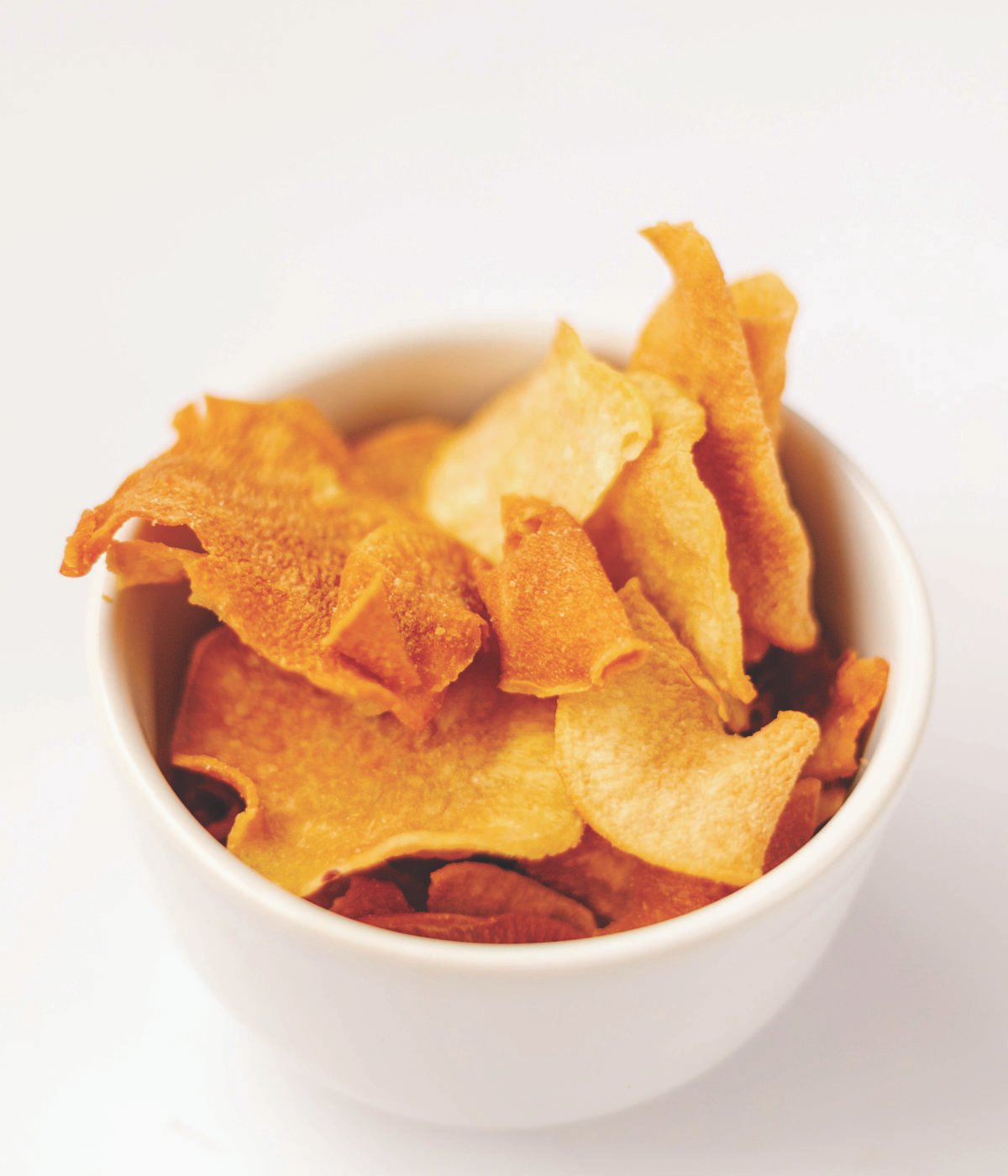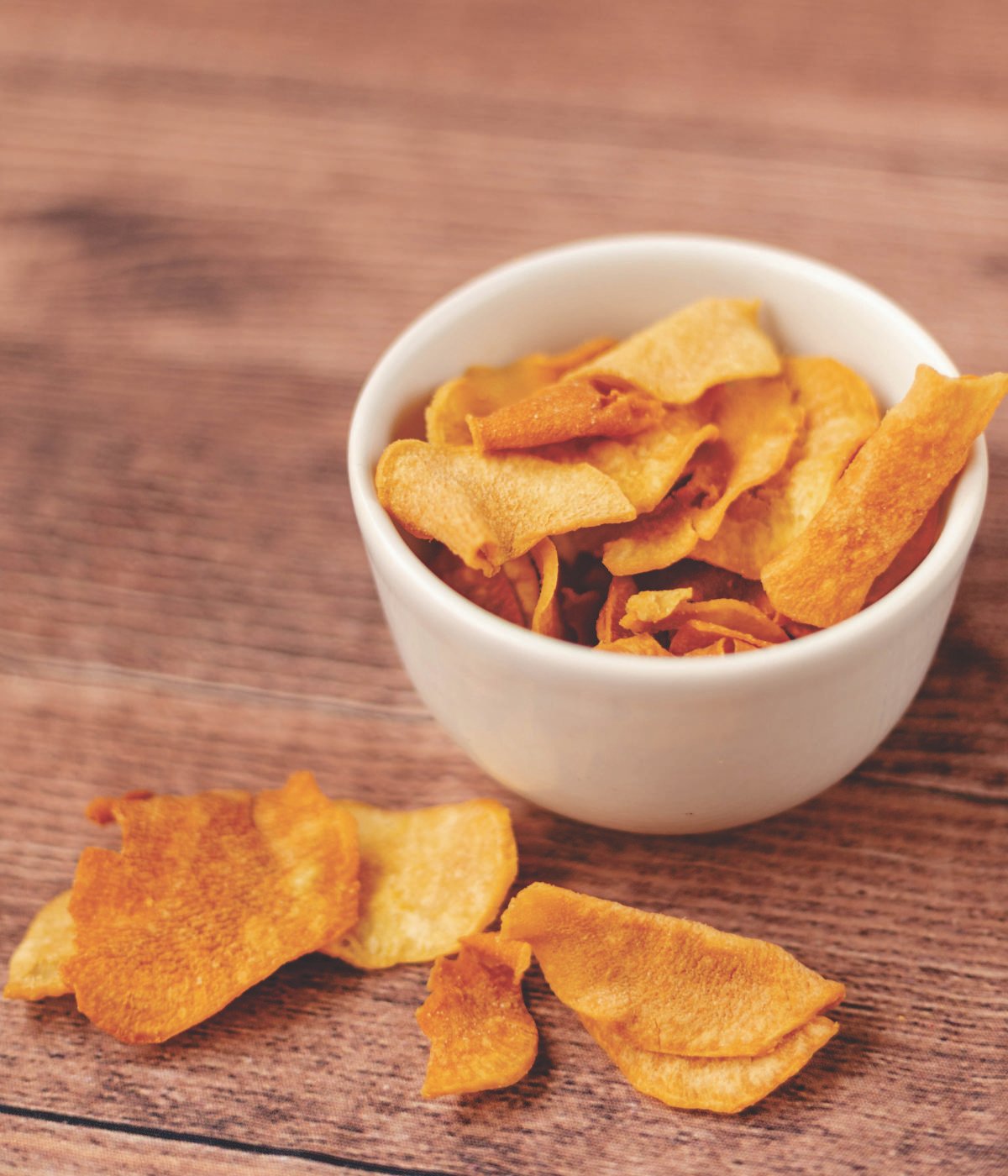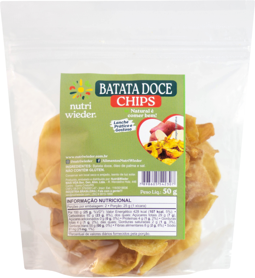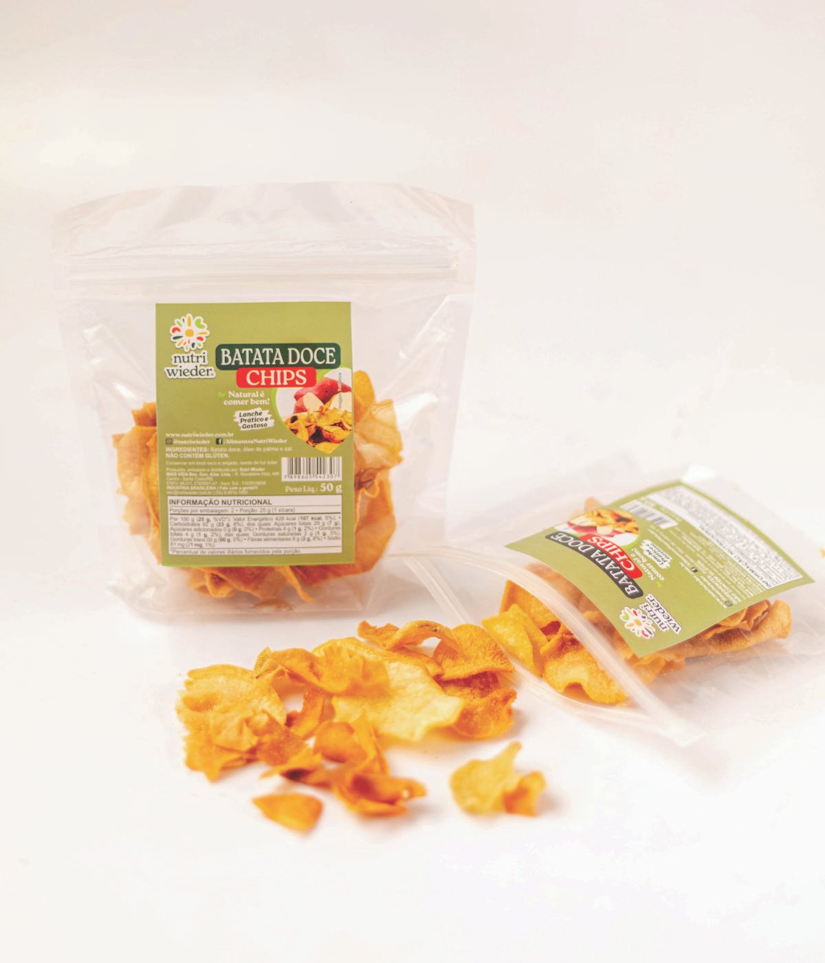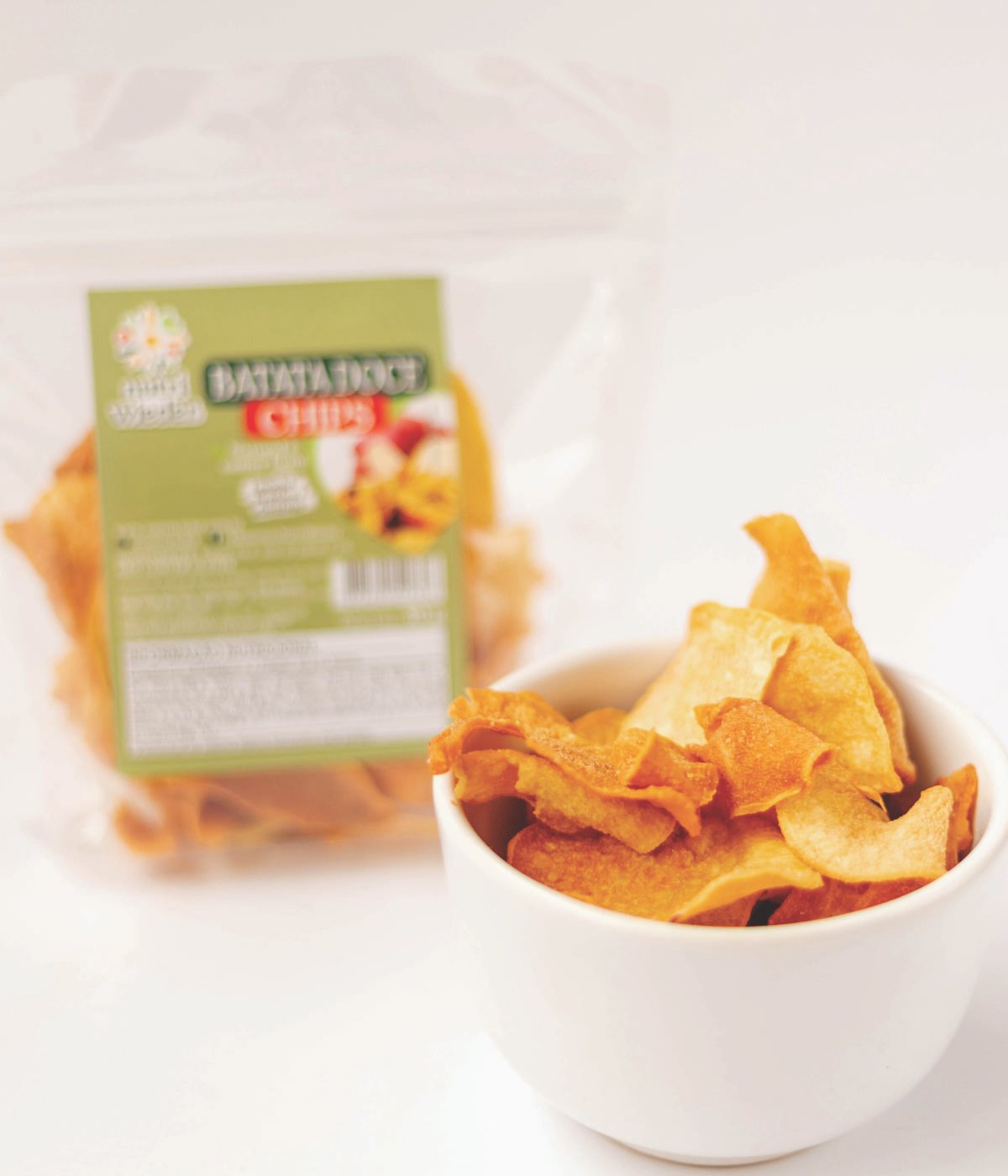 A batata doce chips possui somente ingredientes de origem natural. Um snack crocante que é a opção de um salgadinho mais saudável, sem corantes, conservantes e aromatizantes artificiais.