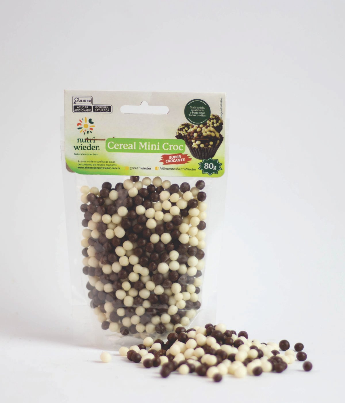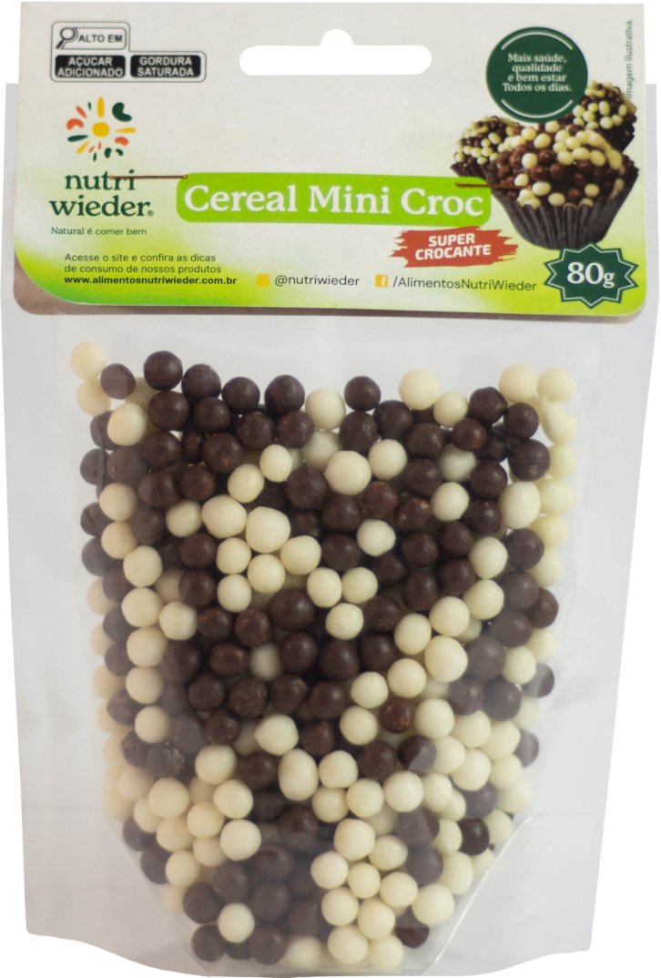 O confeito Cereal Mini Croc Nutri Wieder contém flocos de arroz cobertos com chocolate ao leite e chocolate branco. SUPER CROCANTE!