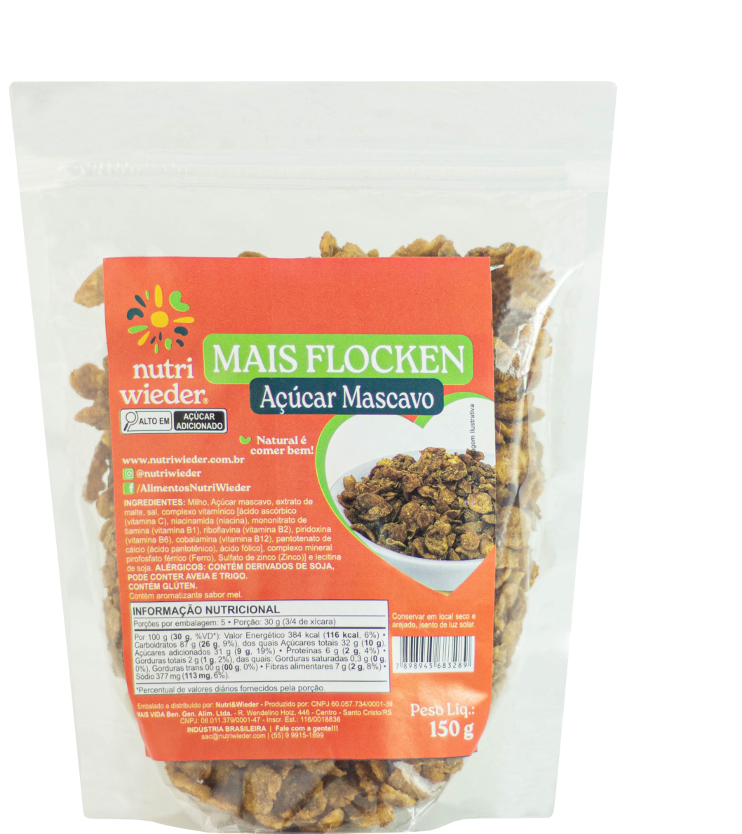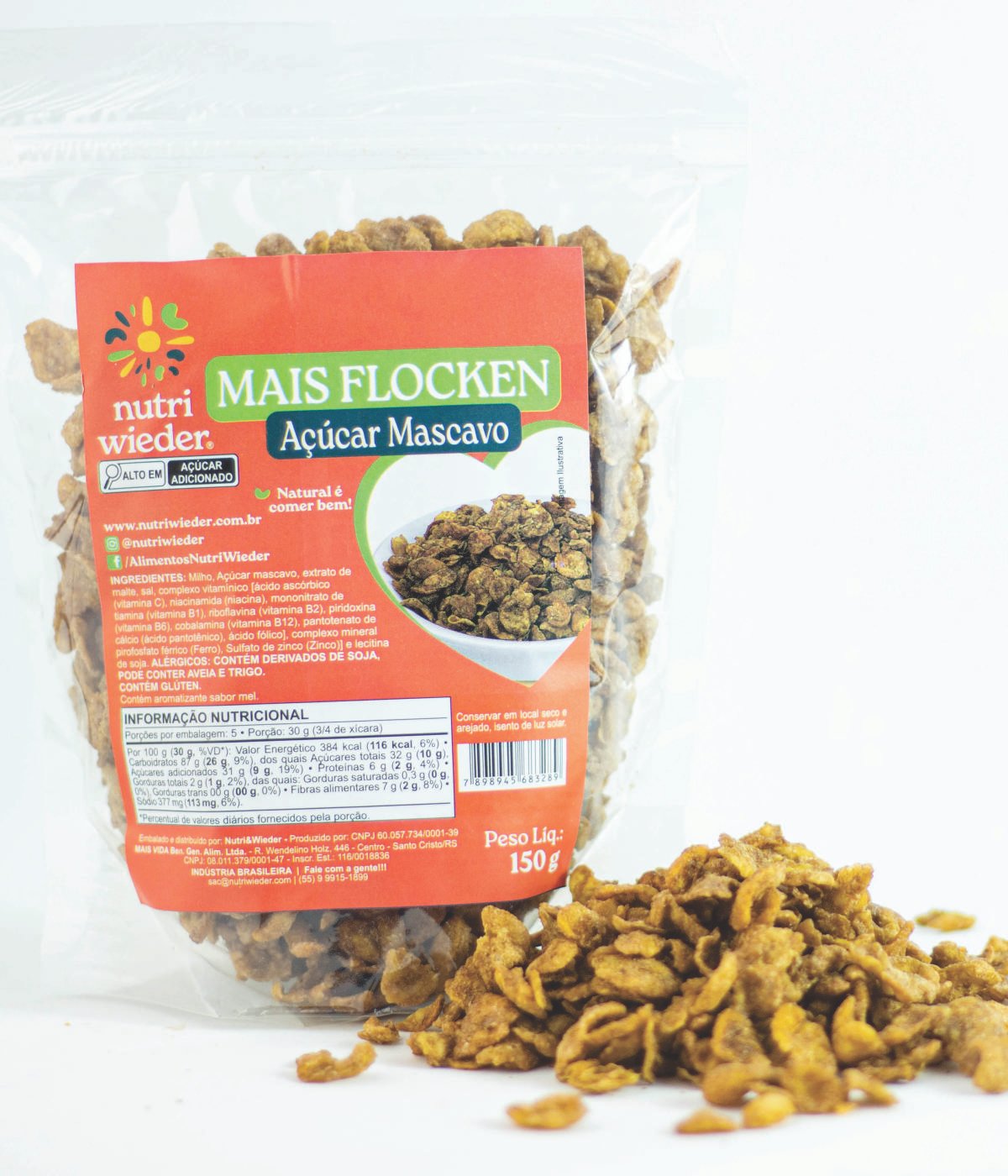 Cereal de milho com açúcar mascavo Nutri Wieder, rico em vitaminas, minerais e fibras que proporcionam mais saúde, energia, alegria e bem-estar. Ideal para ser consumido com leite, iogurte, frutas, açaí ou puro.